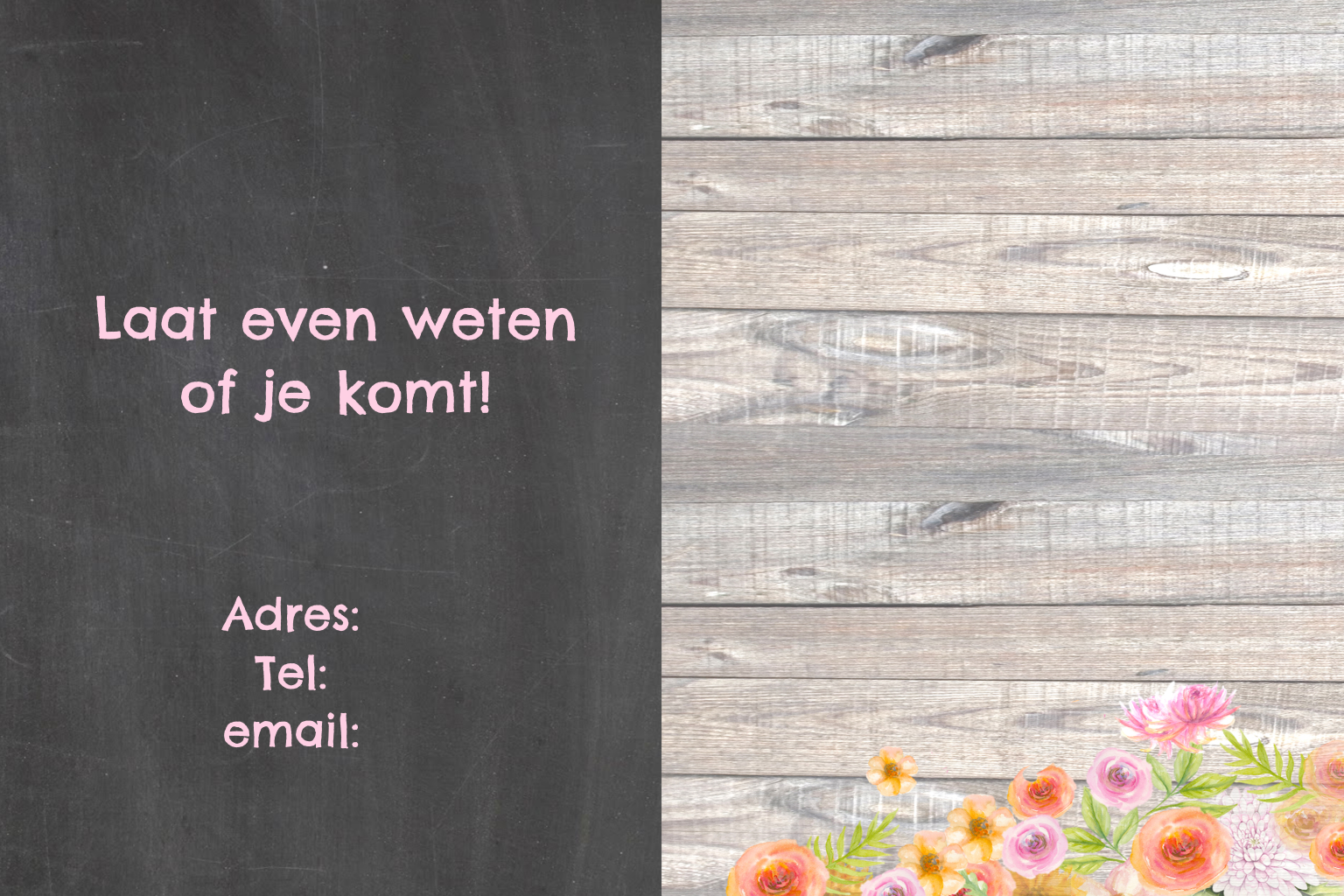 Uitnodiging 50 jarig huwelijk met krijtbord hartje. Roze en oranje roosjes.(1183)