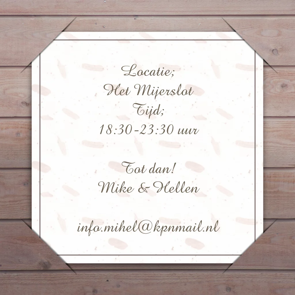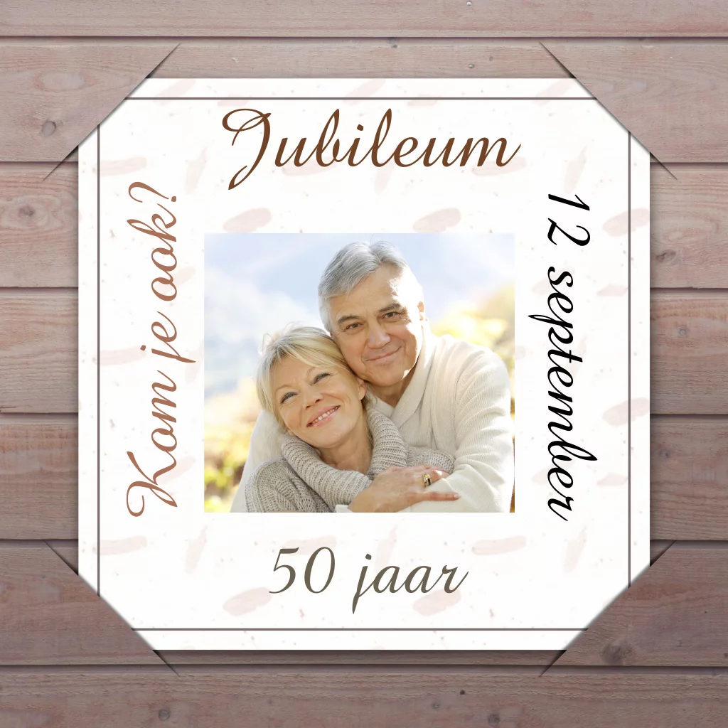 Een feestelijke uitnodiging voor een 50 jarig jubileumfeest met hout op de achtergrond en een foto in een lijst. (7473)