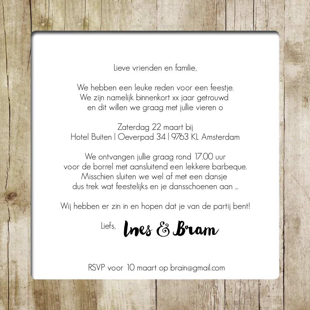 Superleuke en stoere 50 jaar getrouwd uitnodiging die altijd slaagt. De teksten op de houten bordjes zijn allemaal te veranderen en binnenin plaats je je eigen foto. (21438)