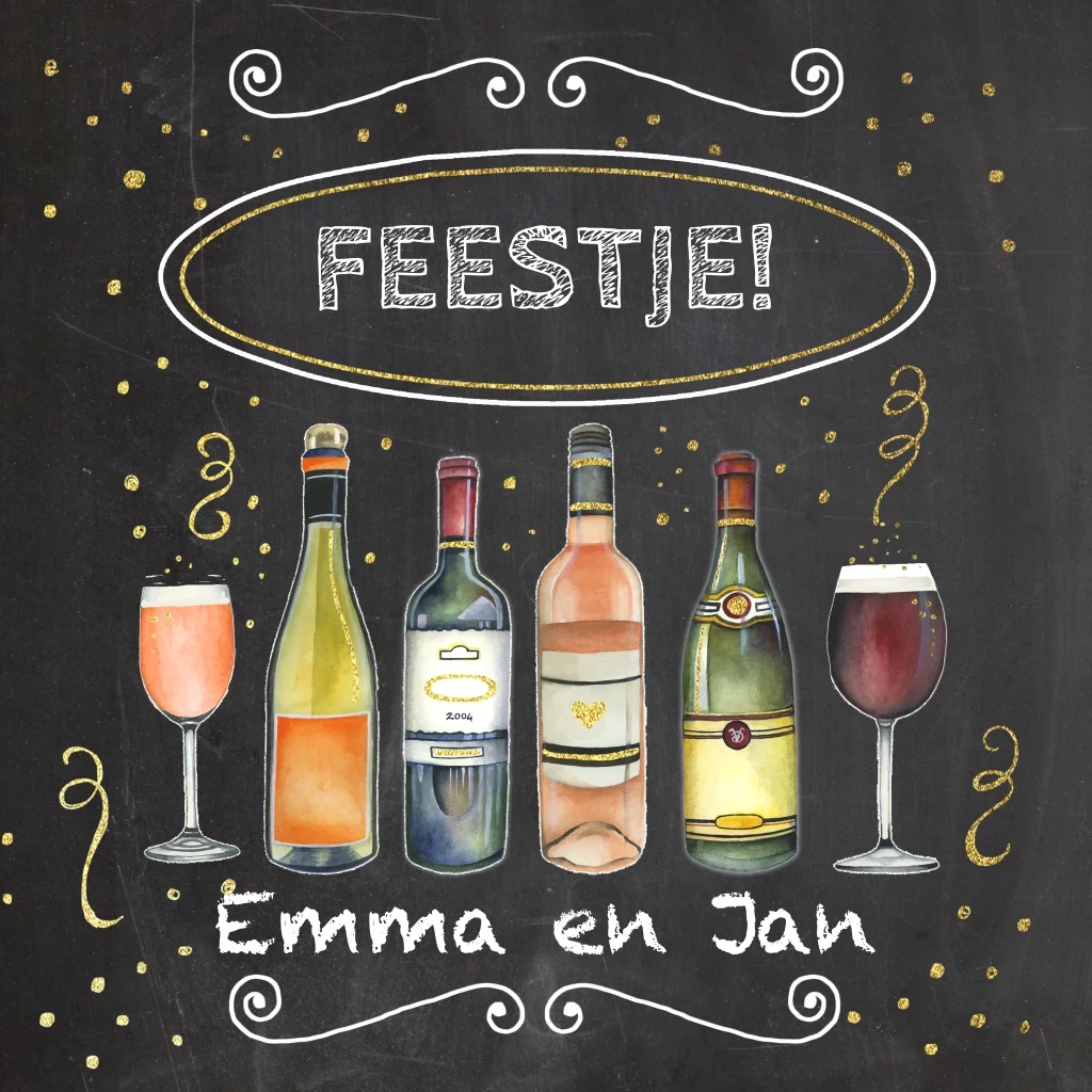 Uitnodiging op krijtbord grijs met flessen wijn voor een jubileumfeest 50 jaar getrouwd. (4837)