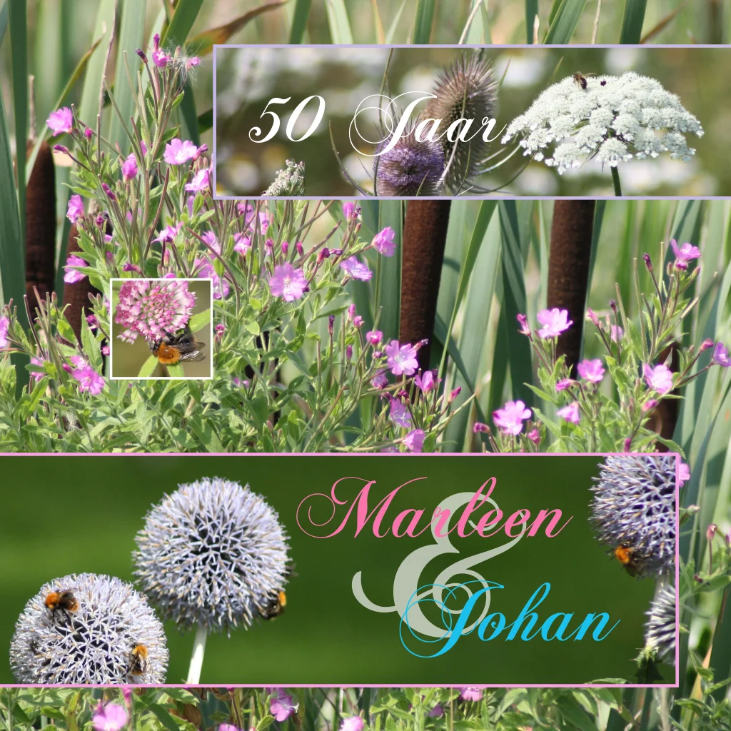 Natuur thema uitnodiging met veel roze en paarse bloemen voor een 50 jaar samen-feest. Groene achtergrond.