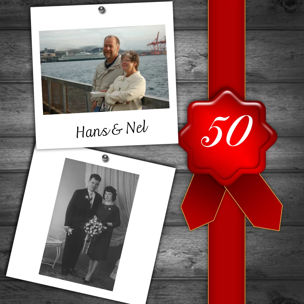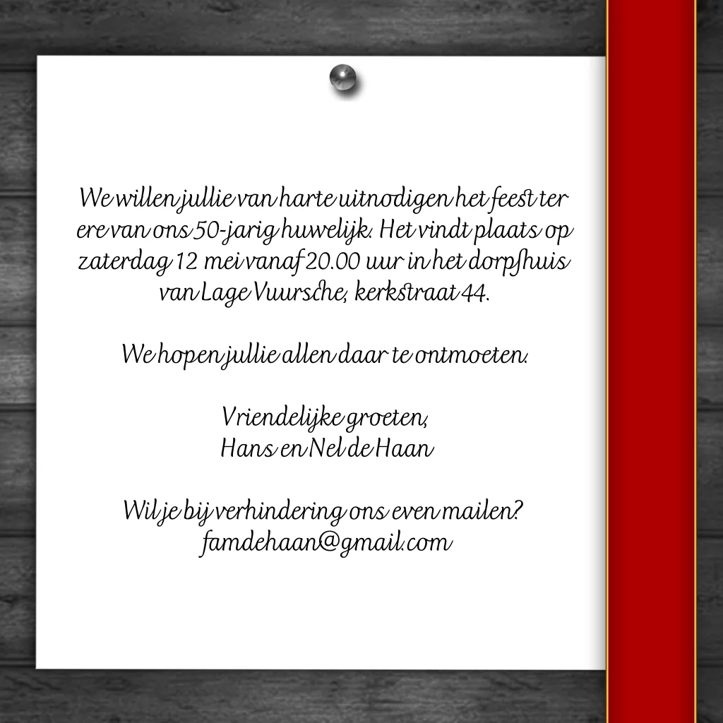 Uitnodiging huwelijk jubileum 50 jaar getrouwd met hout. Rode zegel voor jaartal. (463)