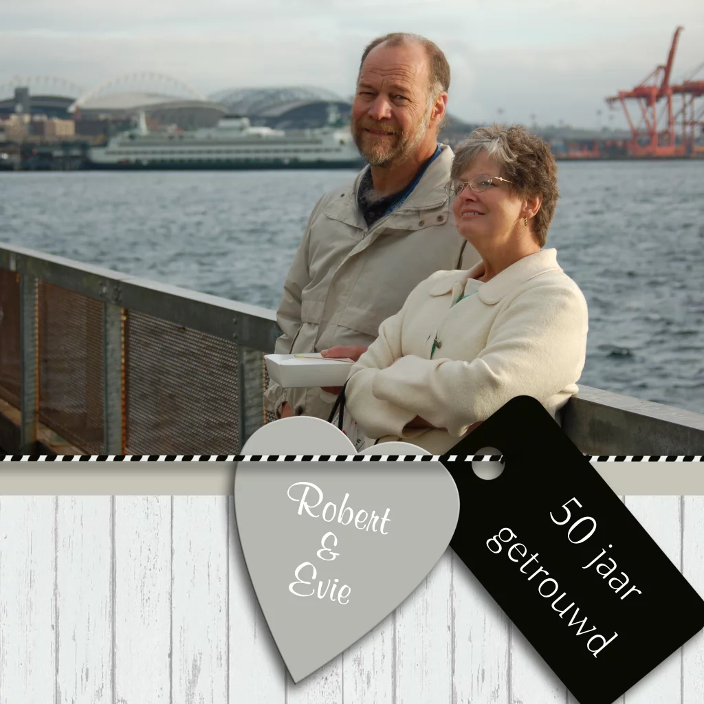 Uitnodiging met foto 50 jaar getrouwd. Zwart naam label en een eigen foto met mooi grijs hout(486)