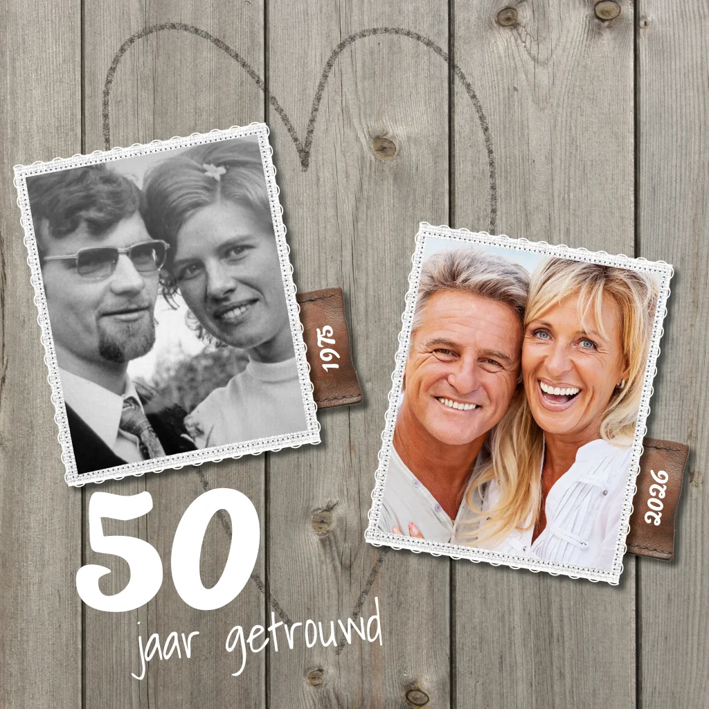 Uitnodigingskaart hout 50 jaar getrouwd met oude foto. Houten planken en getekend hart. (1726)