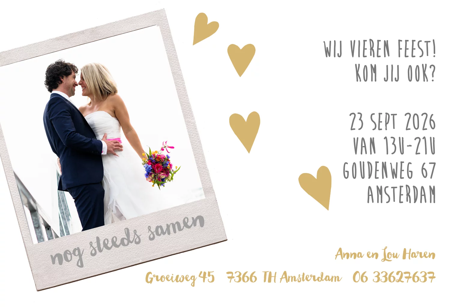 Eenvoudige originele uitnodigingskaart voor jullie 50 jarig jubileum, gouden-huwelijk, goud-look! Hip en trendy met hart pijl. (3776)