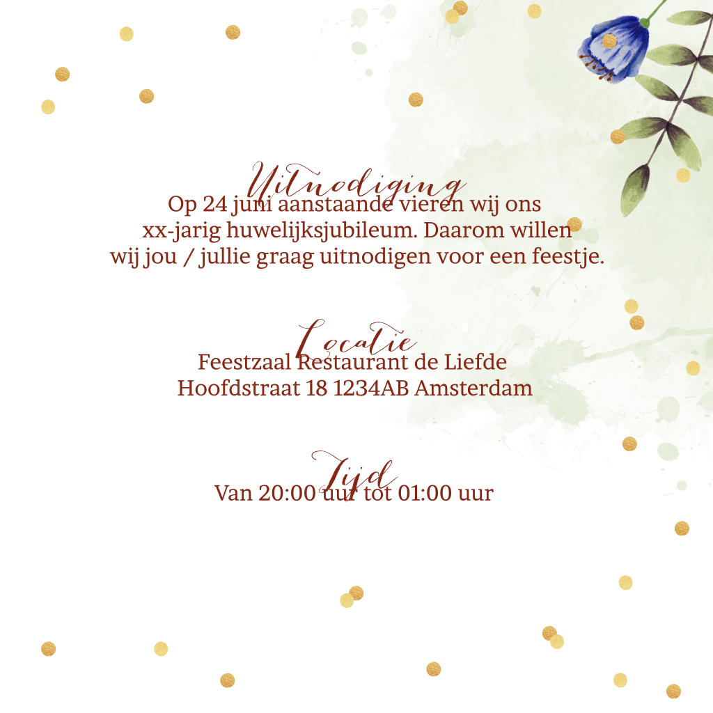 Een mooie uitnodiging voor een huwelijksjubileum, met bloemen, eucalyptus en een foto. Vervang zelf de foto en pas de teksten aan. (7005)