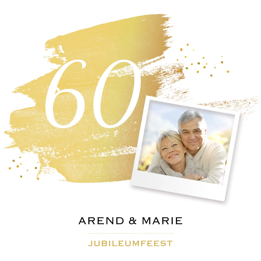 Jubileum uitnodiging 60 jaar getrouwd goudkleurige tinten confetti met waterverfstreep en foto. (7457)