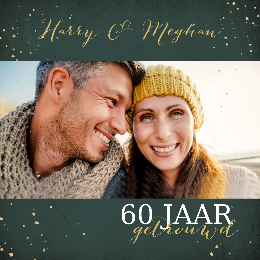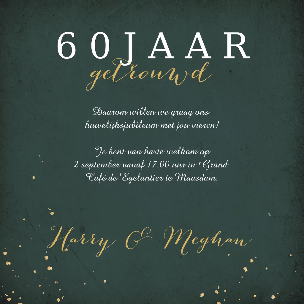 Maak deze feestelijke jubileumkaart voor jullie 60 jarige huwelijksjubileum. Met fraaie gouden confetti en combineer het goud mooi met de groene achtergrond. (20292)
