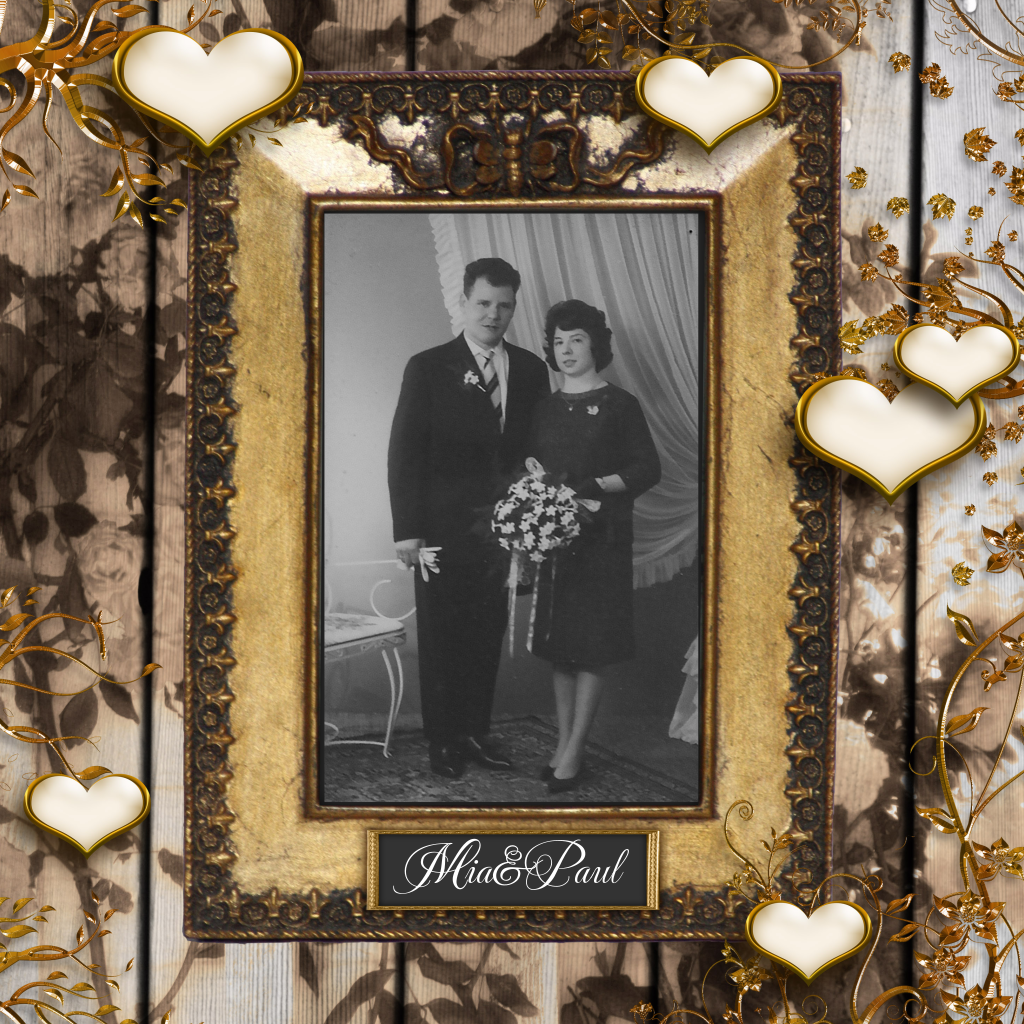 Originele kaart voor een zestige huwelijksjubileum in sepia kleuren. Hartjes en sierlijke ornamenten en fotoframe.