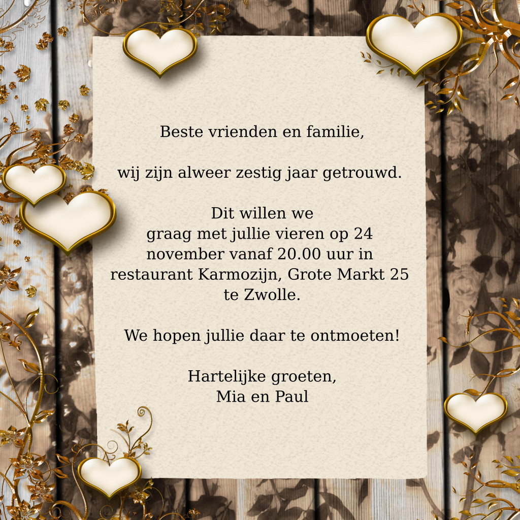 Uitnodigingskaart zestige huwelijksjubileum hartjes en eigen foto