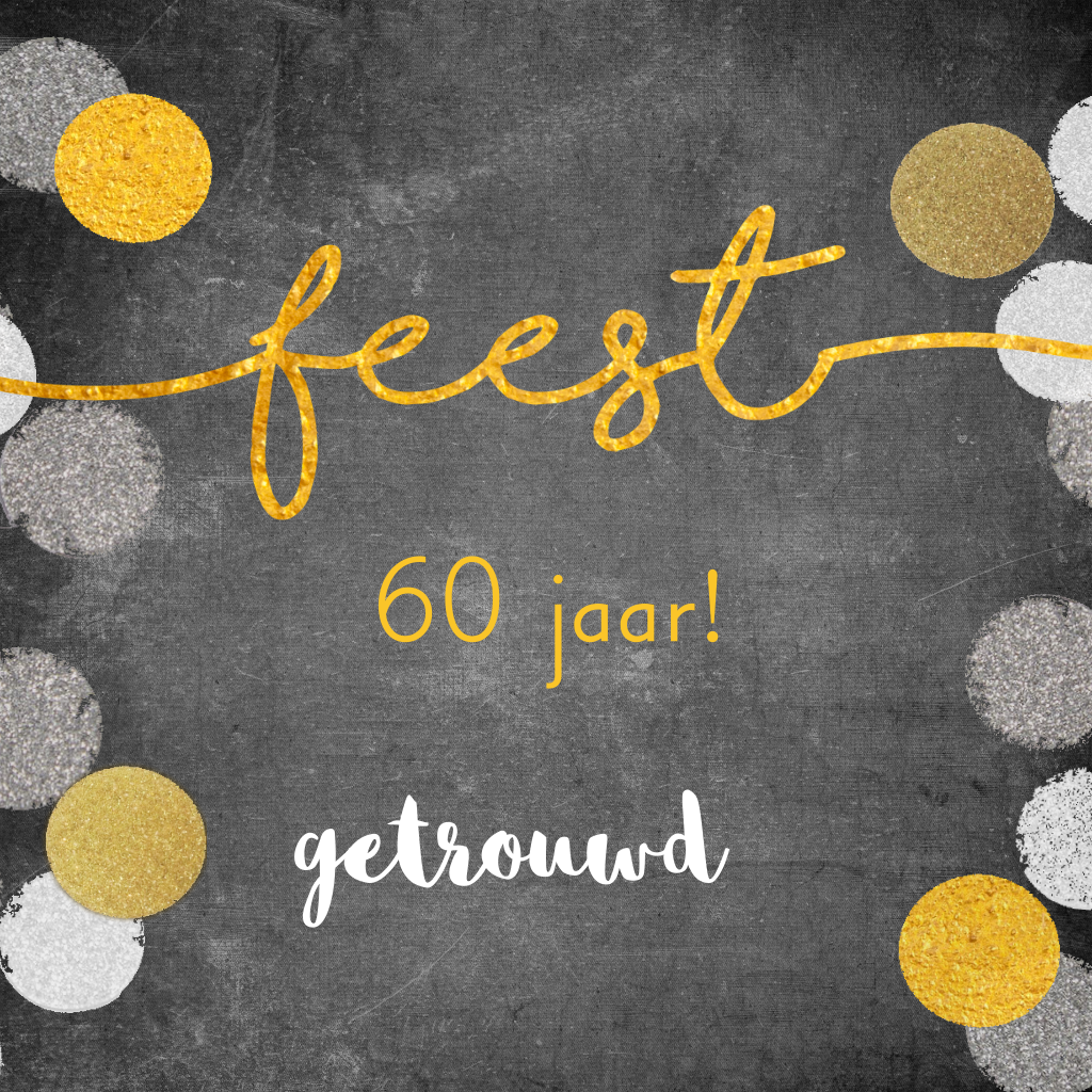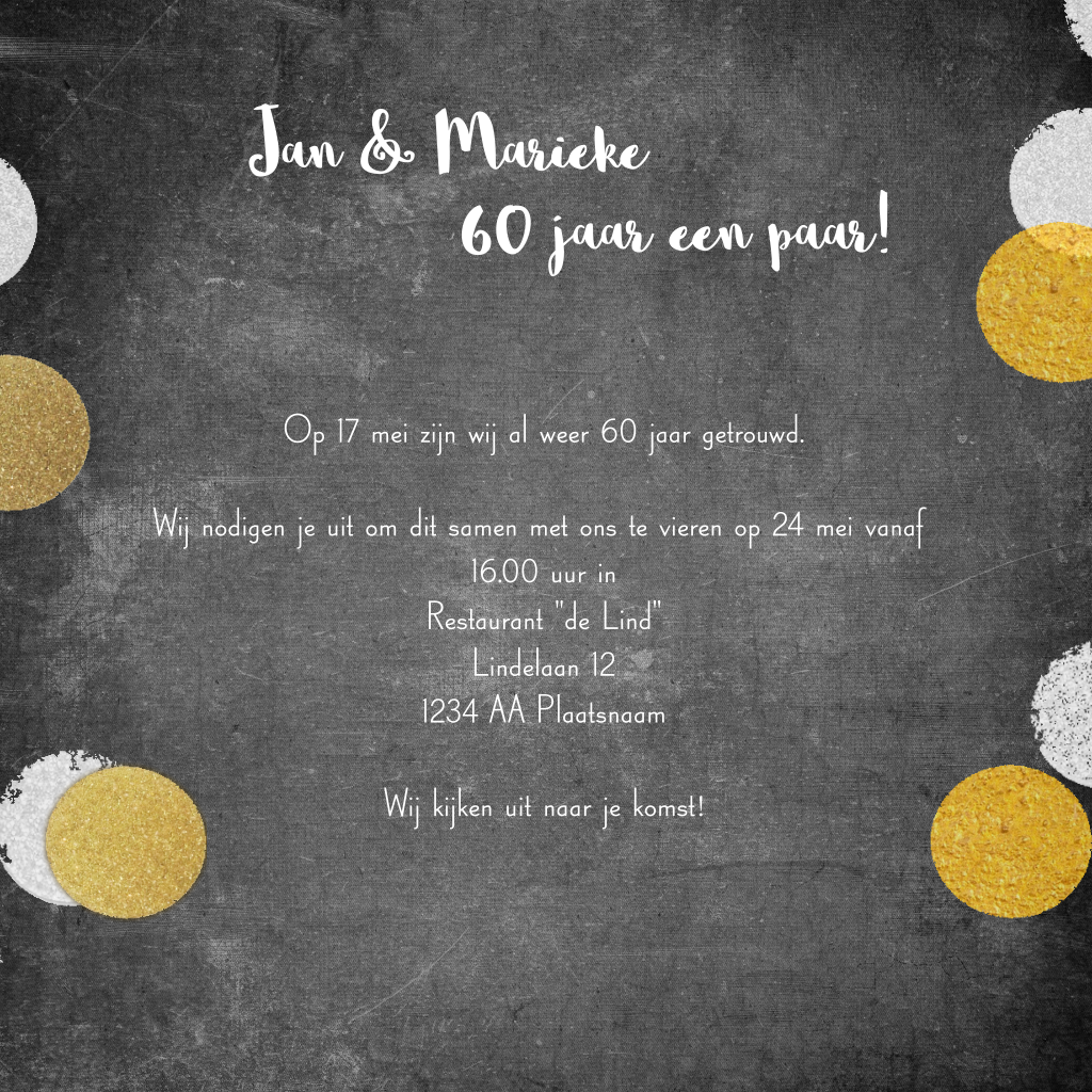 Moderne uitnodiging voor een 60 jaar getrouwd feest. Trendy design met confetti in zilver, goudkleur en grijs en goudkleurige letters. (4391)