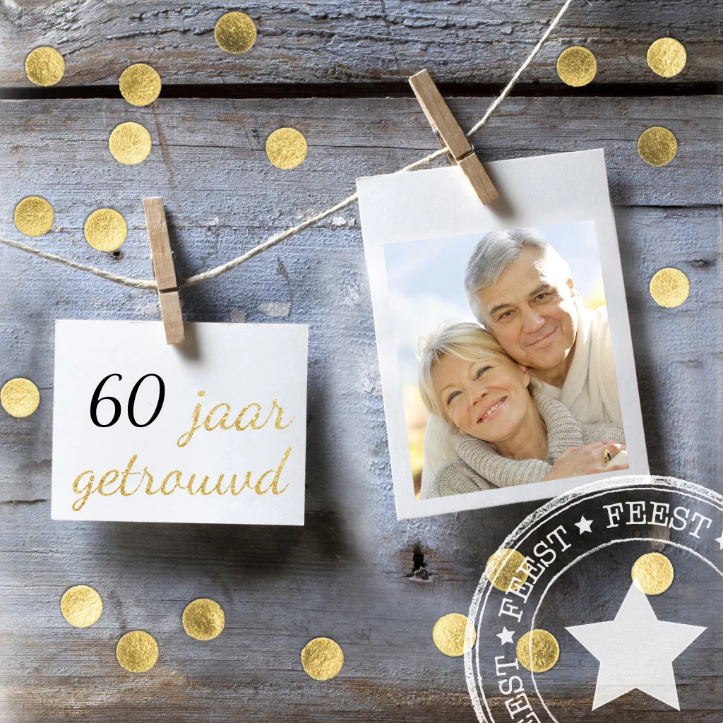 Uitnodiging 60 jarig jubileum feest met hout en gouden confetti