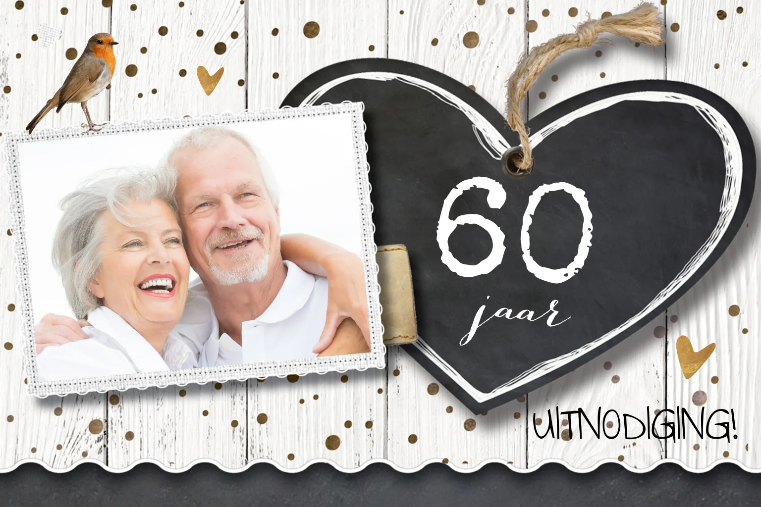 Jubileum uitnodiging 60 jaar getrouwd wit hout met hart en krijtbord