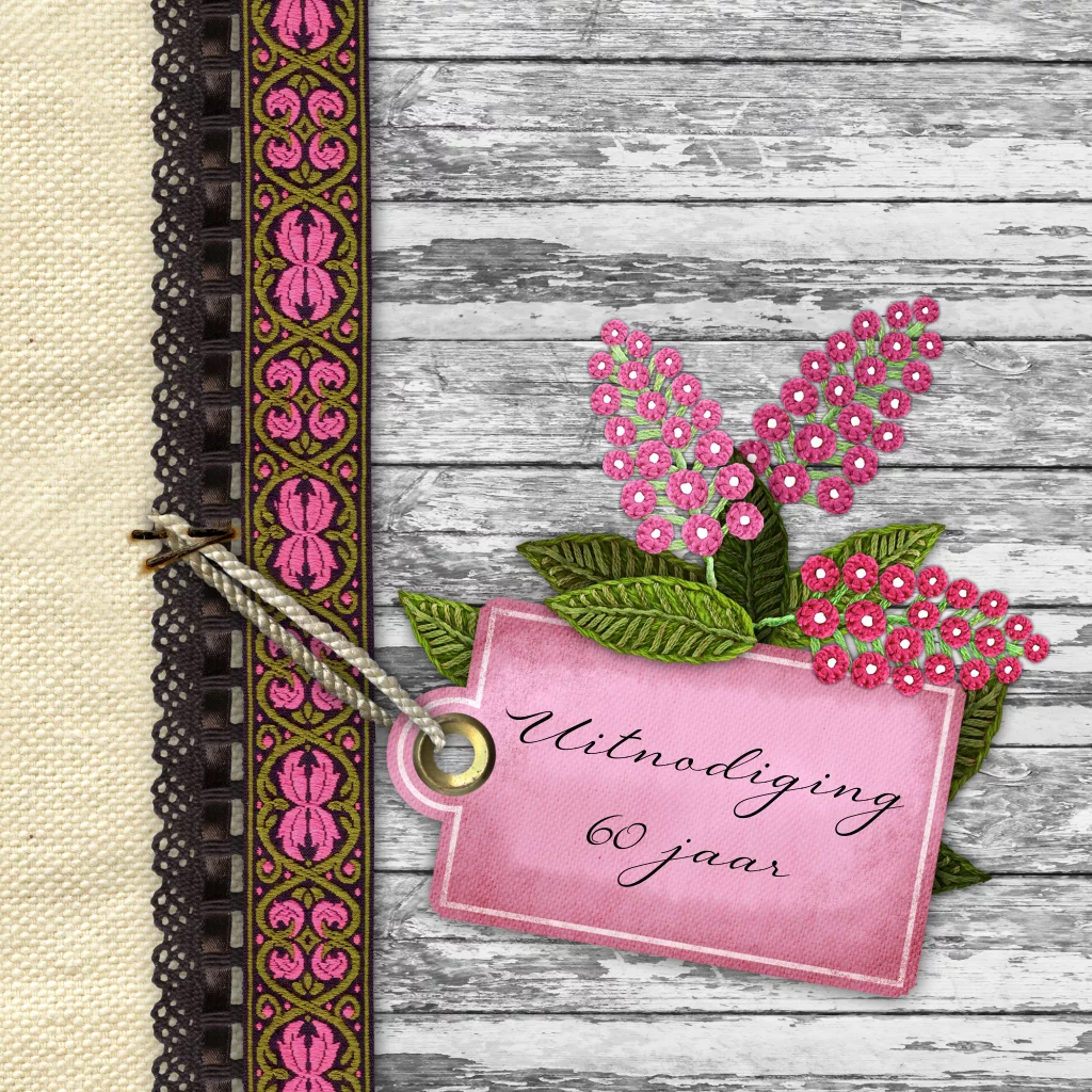 Uitnodiging 60 jaar met roze band, roze label en hyacinten met groene blaadjes op de voorkant.