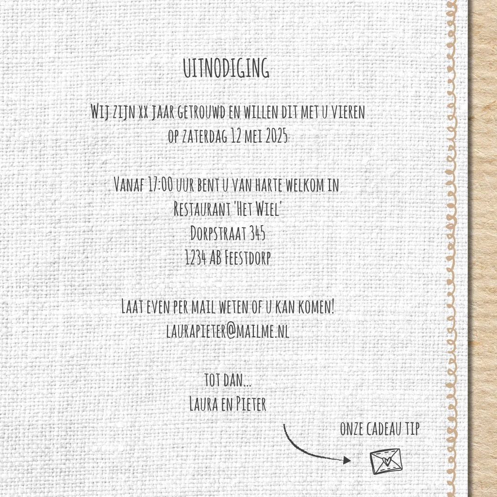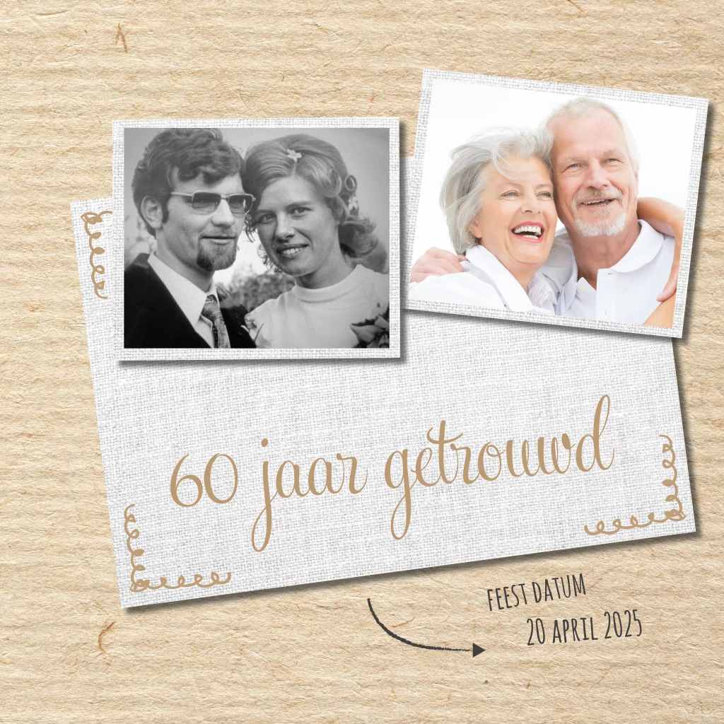 60 jaar getrouwd jubileumkaart met foto. Linnenstofje aan de binnenzijde. (2081) Dit is een leuke uitnodigingskaart voor een feestje met een frisse en moderne uitstraling
