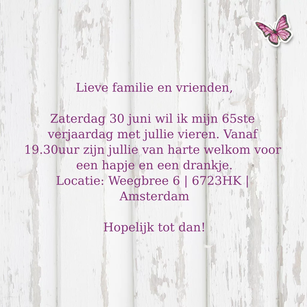 65 jaar uitnodigingskaart uitnodiging feest met paarse bloemetjes. Licht grijs sloophout op de achtergrond. (720)