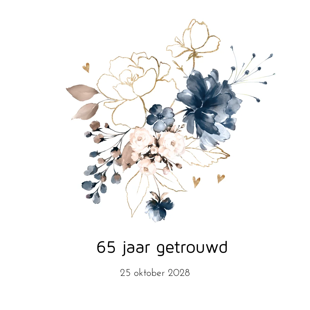 Jubileum uitnodiging 65 jaar getrouwd bloemen blauw en goud