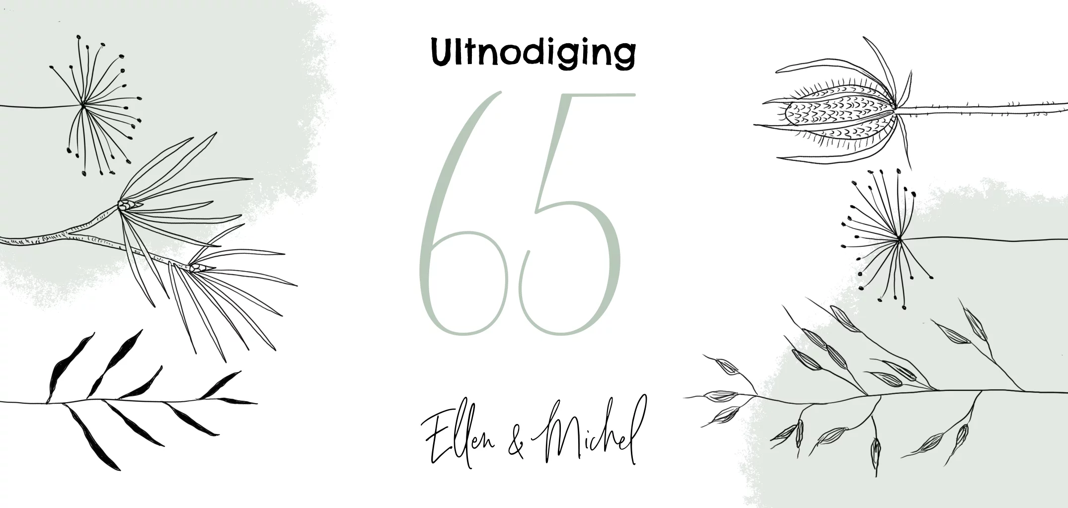 Een hippe jubileumuitnodiging met takjes in zwart, wit en groen. (20738)