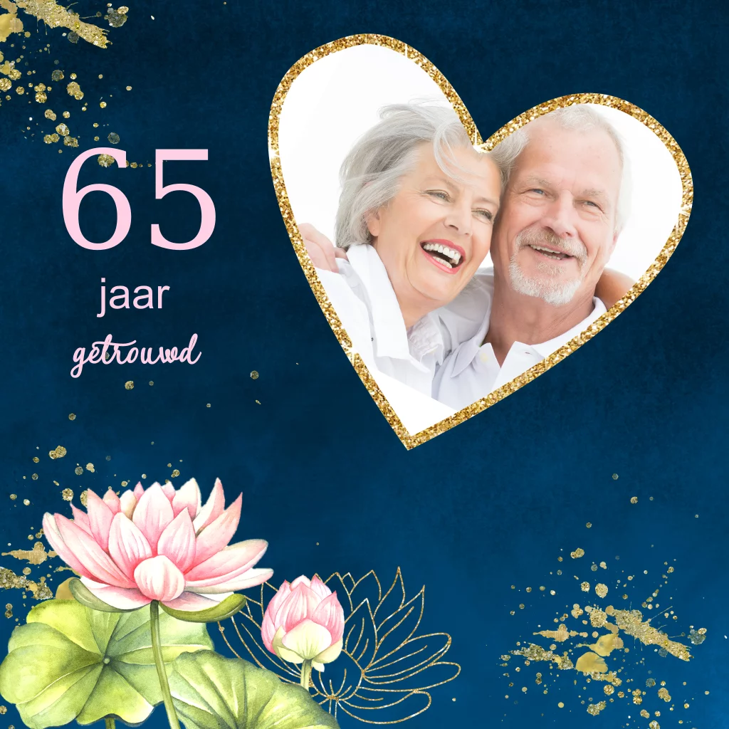 Uitnodiging voor een 65 jaar huwelijksjubileum met mooie lotusbloemen op donkerblauwe achtergrond versierd met goudkleurige glitter. (8402)