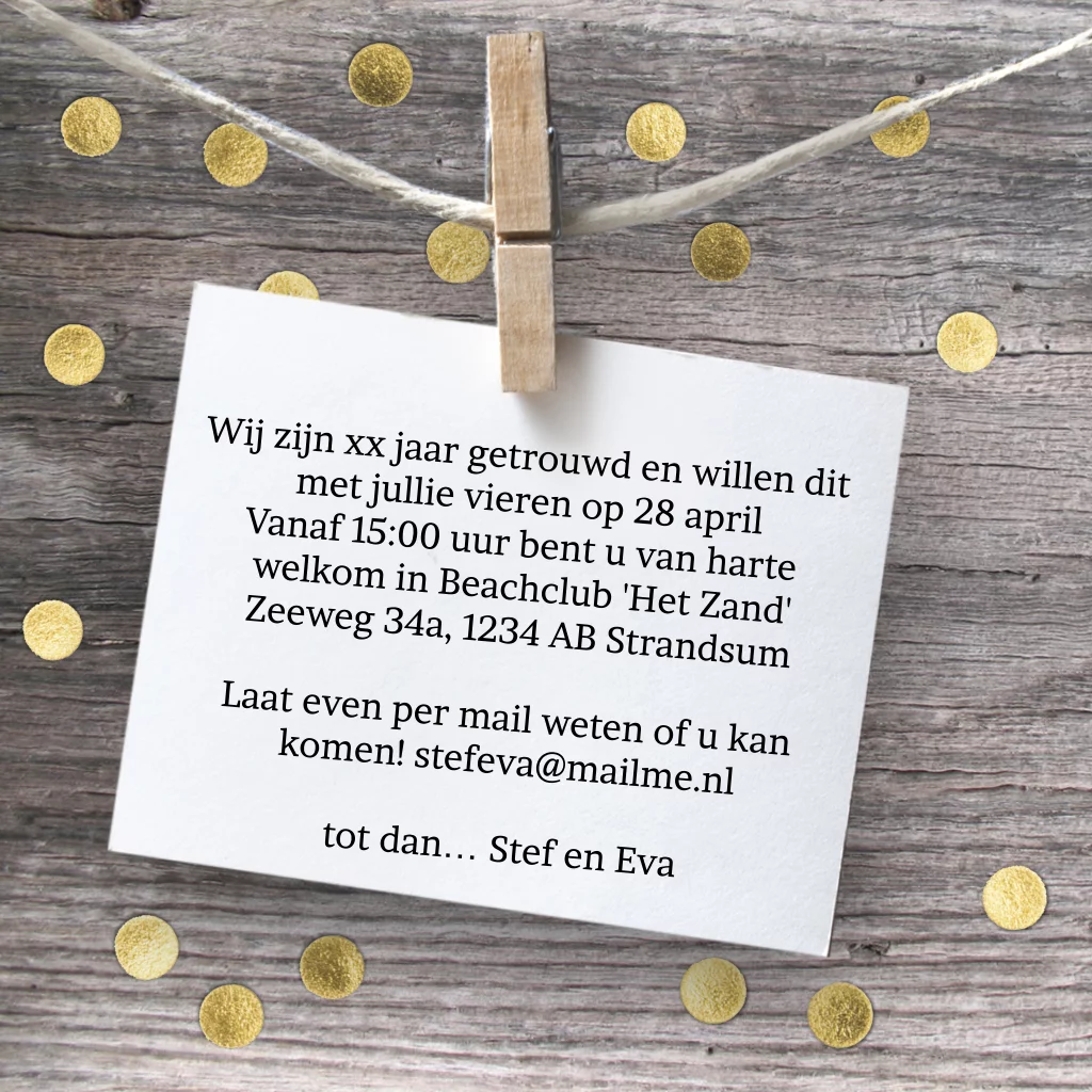 Uitnodiging 65 jaar getrouwd feest met hout en goudkleurige confetti. (6043)