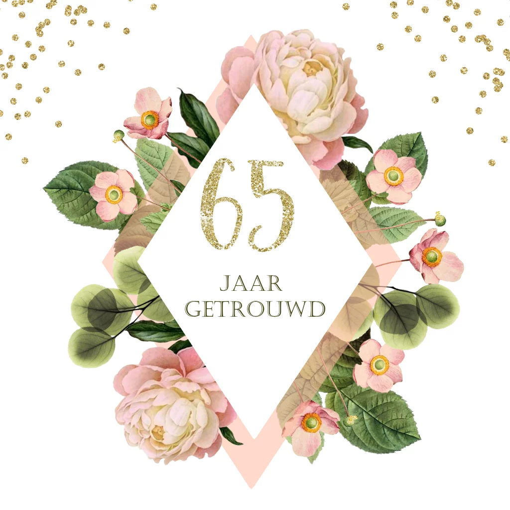 Uitnodiging jubileum 65 jaar getrouwd. Bloemen en gouden glitters.