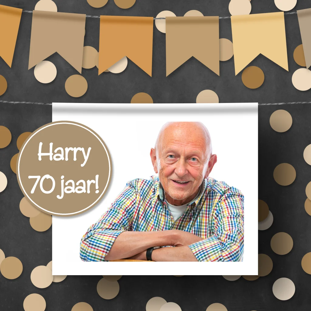 Een feestelijke uitnodiging 70 jaar verjaardag man met hangende foto, slinger en confetti. Het ronde label is verplaats en schaalbaar. (6431)