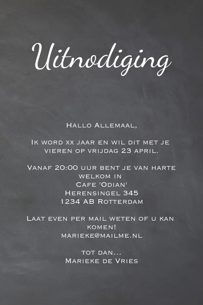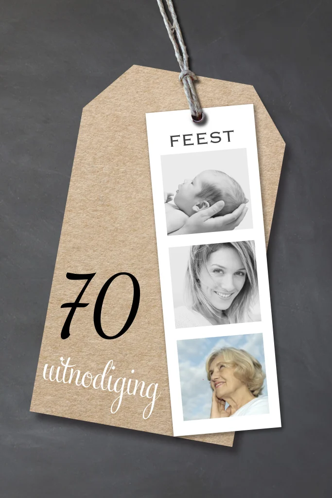 Uitnodiging 70 jaar verjaardag met eigen foto's? Leuke uitnodiging met kraft label en foto strip op een ondergrond van krijtbord print. (3289)