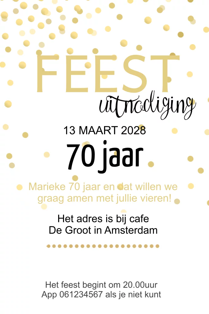 Stijlvolle uitnodiging met gouden confetti 70 jaar