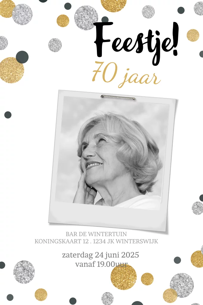 Uitnodiging 70e verjaardag met confetti in zilver en goudlook en foto, teksten zijn geheel aanpasbaar. (5298)