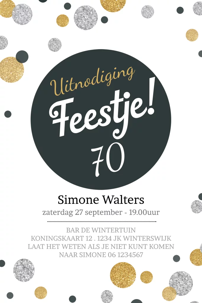 Uitnodiging 70 jaar met confetti in zilver en goudlook