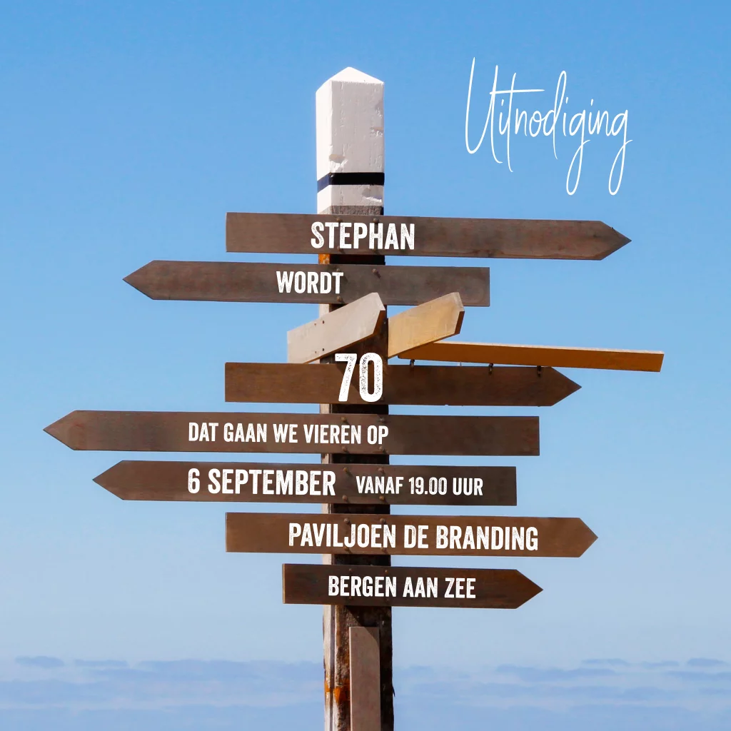 Uitnodiging 70 jaar verjaardag houten wegwijzer bordjes lucht