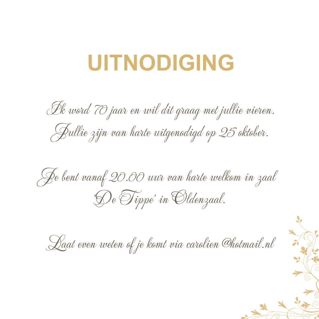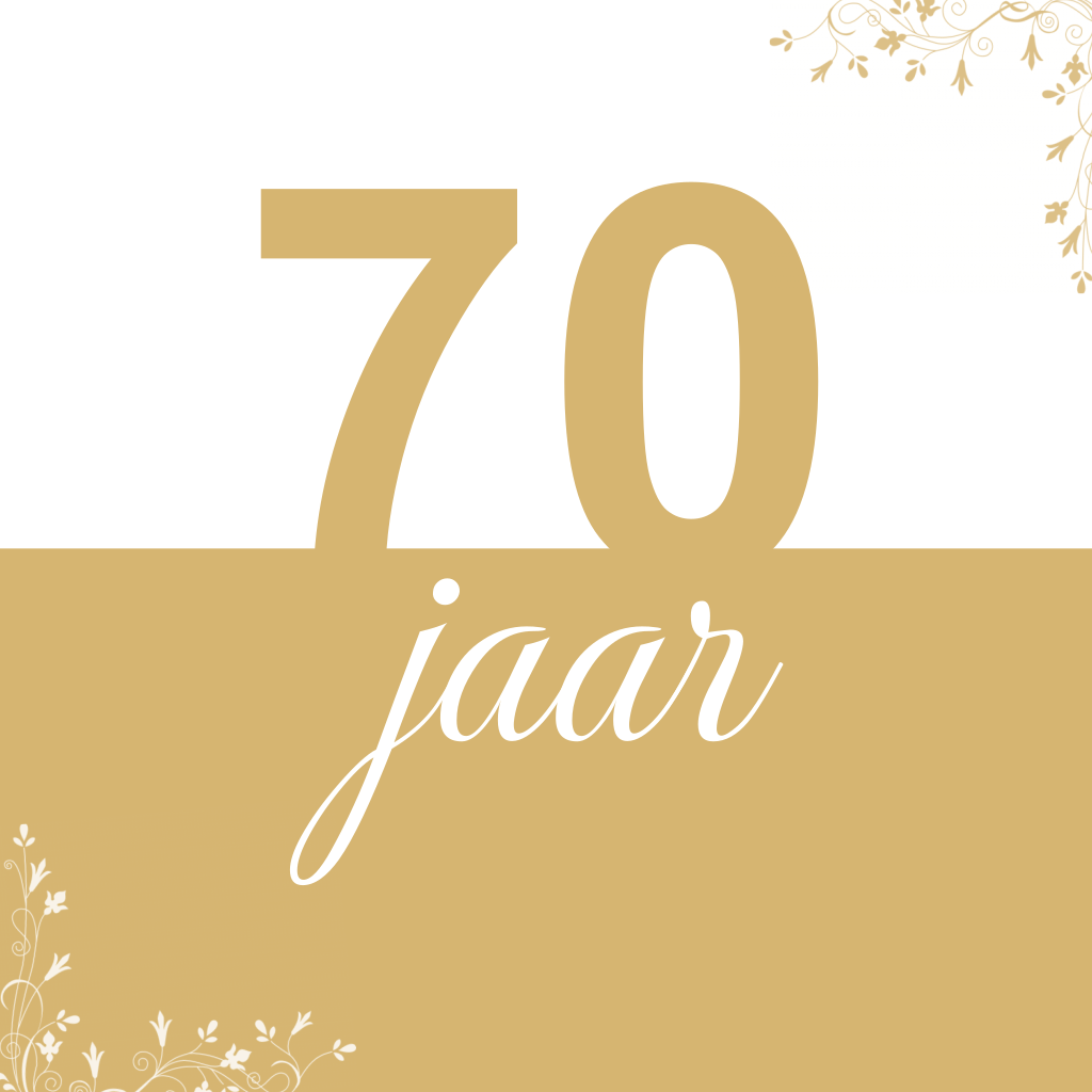 Uitnodigingskaart 70e verjaardag met goud en bloemen