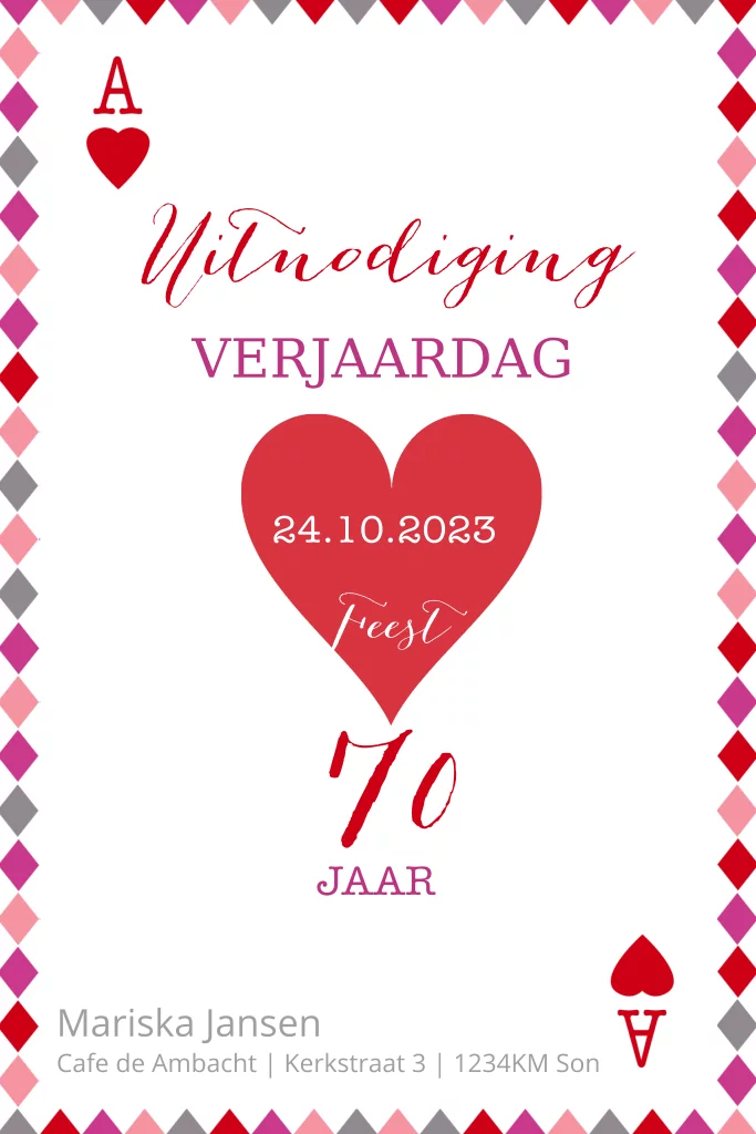 Uitnodiging kaartspel 70 jaar verjaardag kaart roze hart
