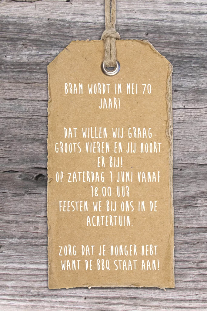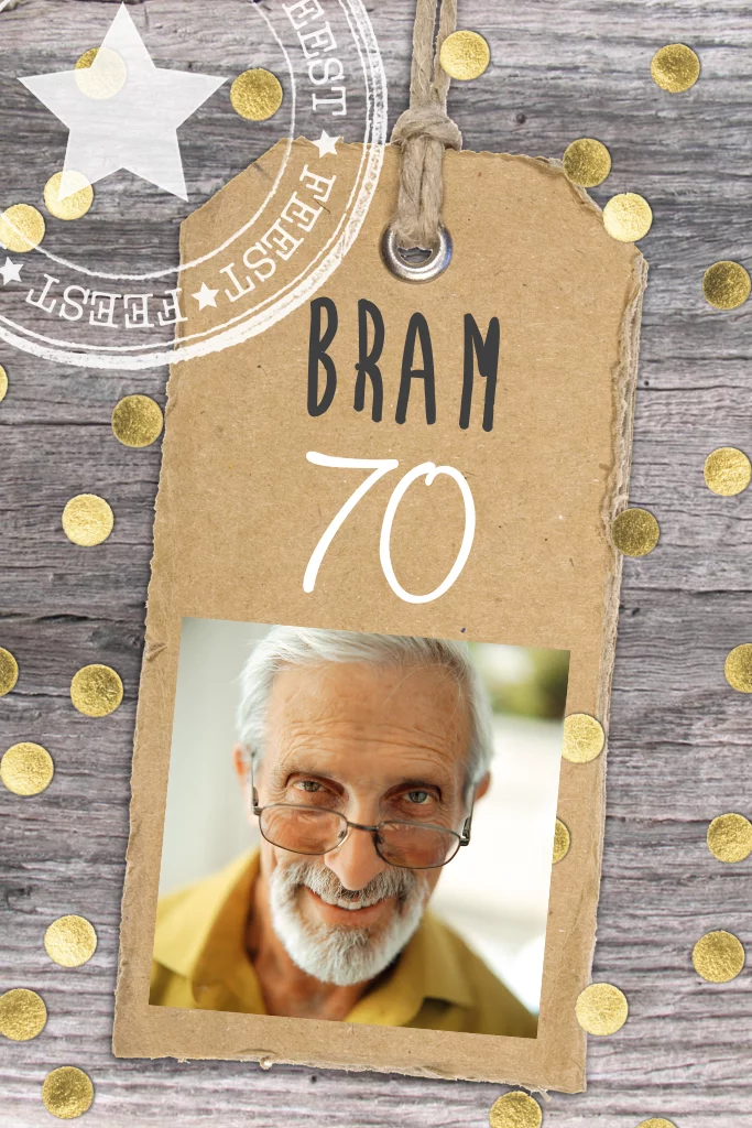 Uitnodiging 70 jaar verjaardag feest met hout en goudkleurige confetti. (5879)