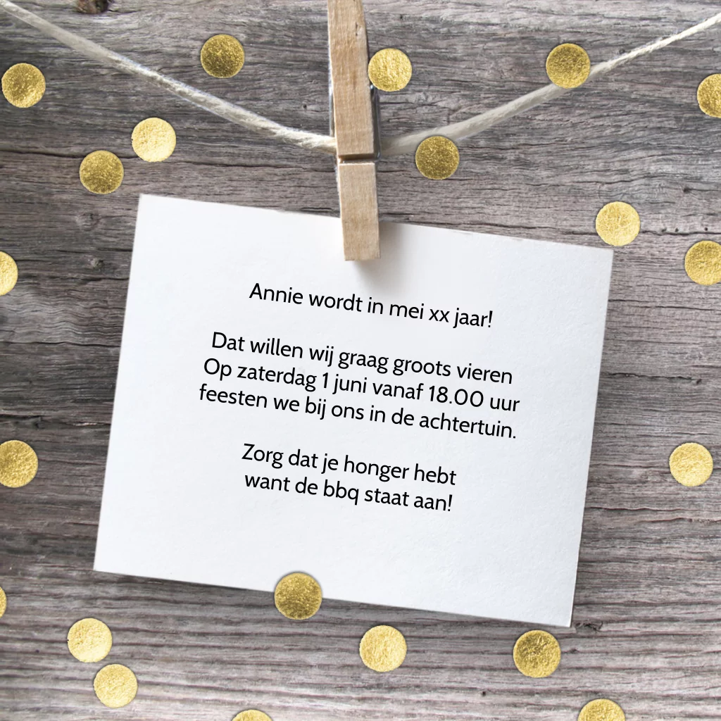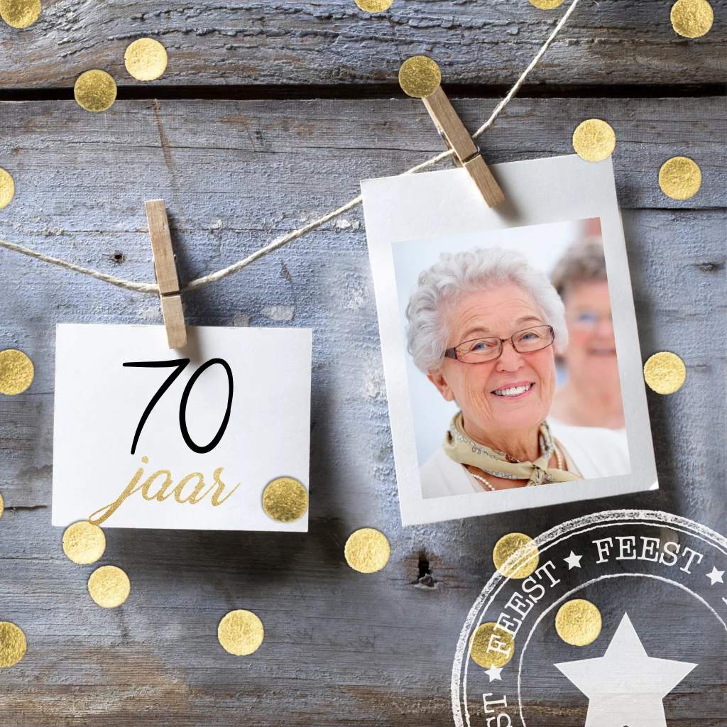 Uitnodiging 70ste verjaardag feest met hout en goudkleurige confetti. Met leuke hippe stempel!