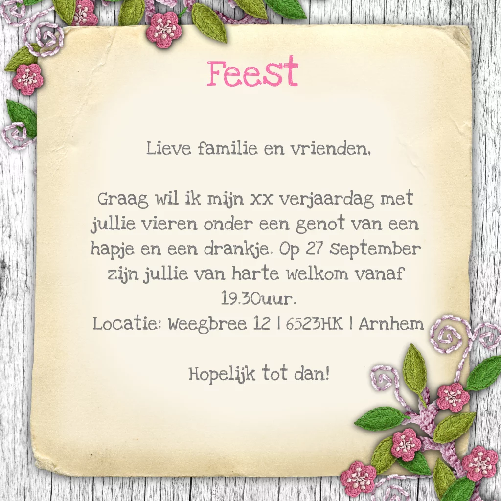 Uitnodigingskaart voor een 70e jaar feestje bloemen en vlinders op een houten achtergrond.