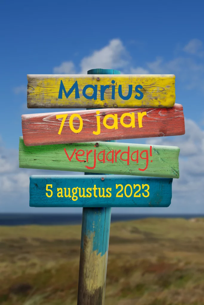 Uitnodigingskaart voor een 70e verjaardag met borden van hout in verschillende kleuren. (3045)