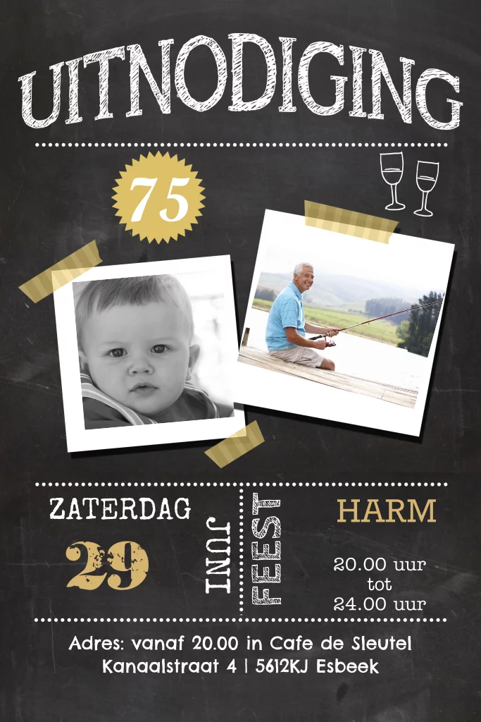 Verjaardag Uitnodiging 75 jaar schoolbord met typografie en foto's. (1665)