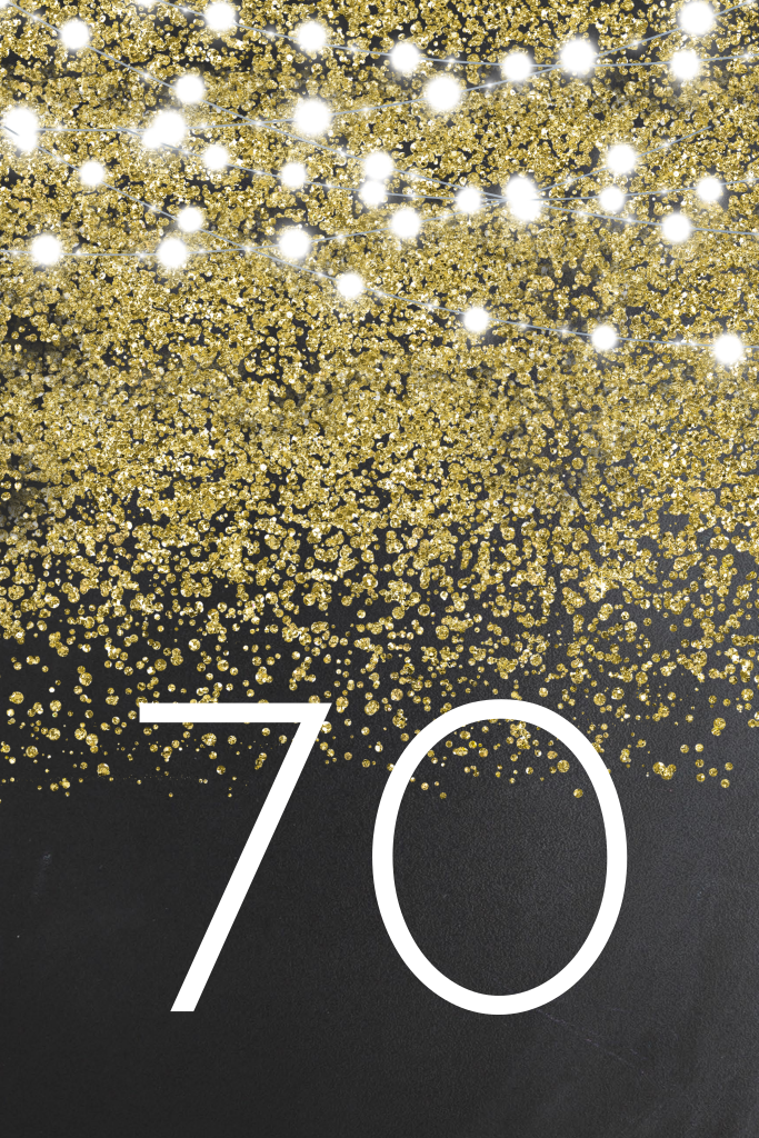 Verjaardagsuitnodiging 70 jaar met goudkleurige glitters op krijtbord. (7139)