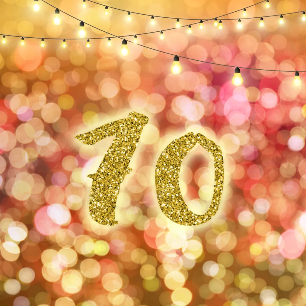 Een lieve en romantische verjaardagskaart voor een 70e verjaardag. Goudkleurige glitter slingers en lichtslingers maken het een feestelijk geheel. (6539) Wil je een ander jaartal in dezelfde stijl op de kaart? Kijk bij afbeeldingen > cijfers of neem contact met ons mee. We zetten dit gratis voor je om.