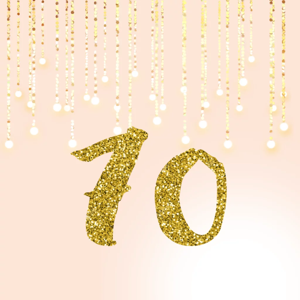 Verjaardagsuitnodiging 70 jaar in roze wit en goudkleur met feestelijke lampjes slingers. (7218)
