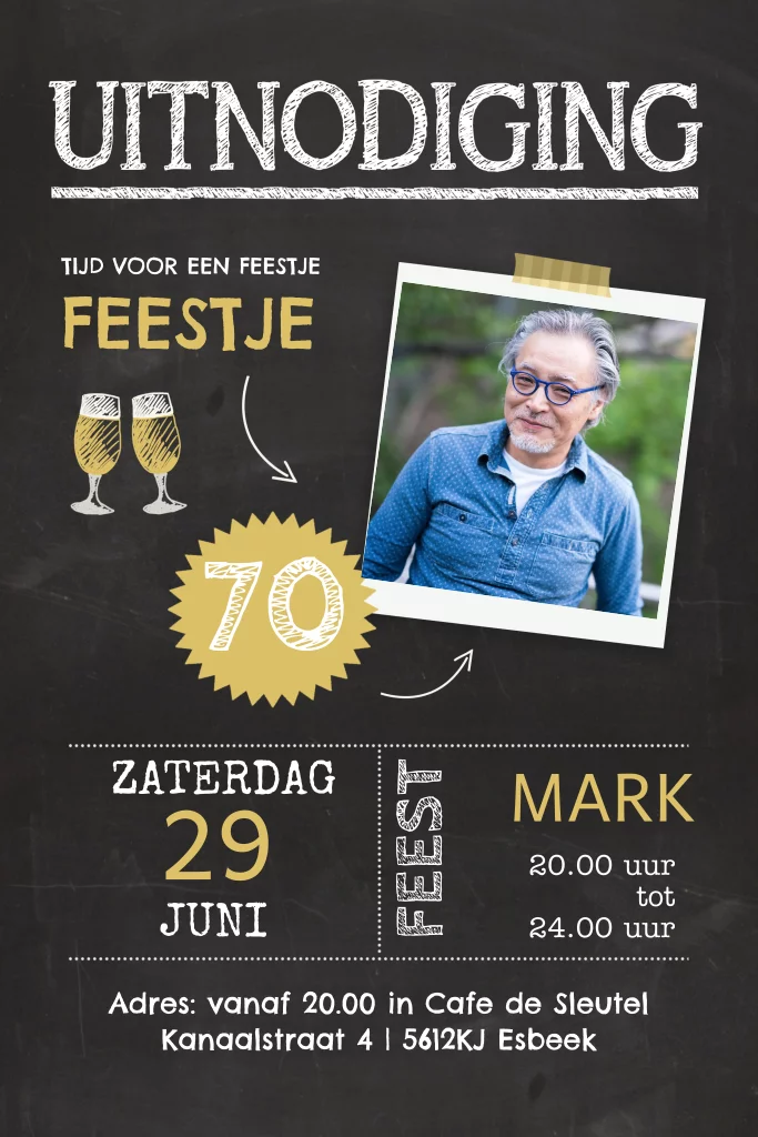 Uitnodiging 70 jaar verjaardag man stoer met foto en bier op krijtbord recht. (20708)
