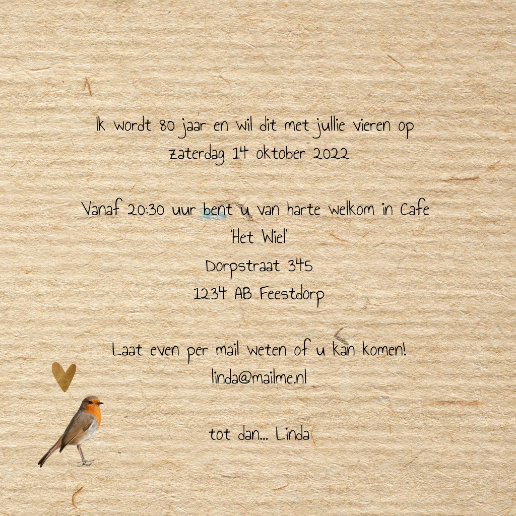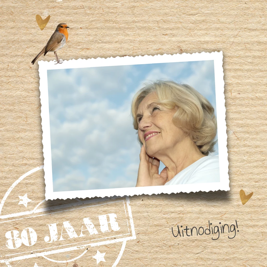 Uitnodigingskaart 80e verjaardag vrouw roodborstje