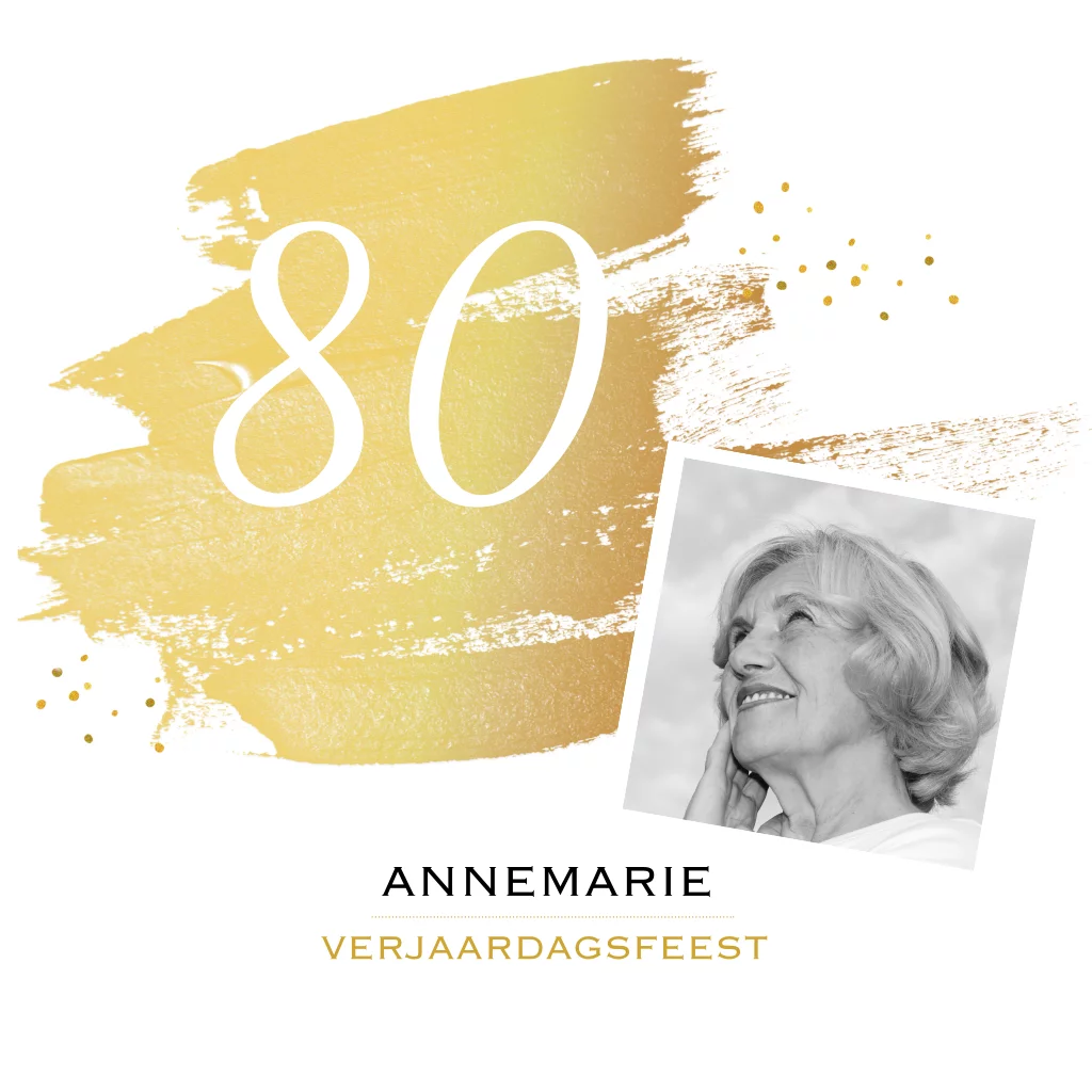 Uitnodiging 80e verjaardag goud tinten confetti streep en foto
