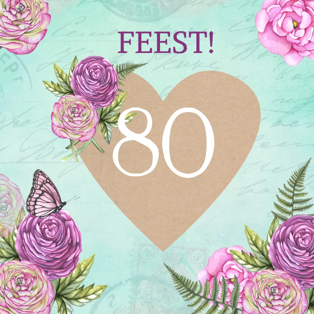 Uitnodiging voor een verjaardag 80 jaar met hart en versierd met bloemen. (3622)