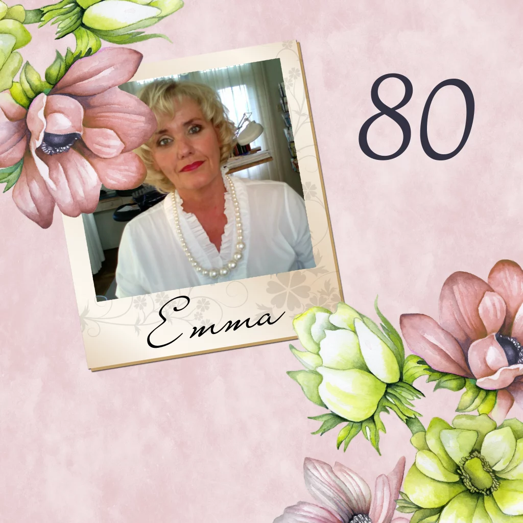 Uitnodiging voor een feestje 80 jaar met mooie anemonen op poederroze achtergrond en leuke foto van de jarige. (4871)