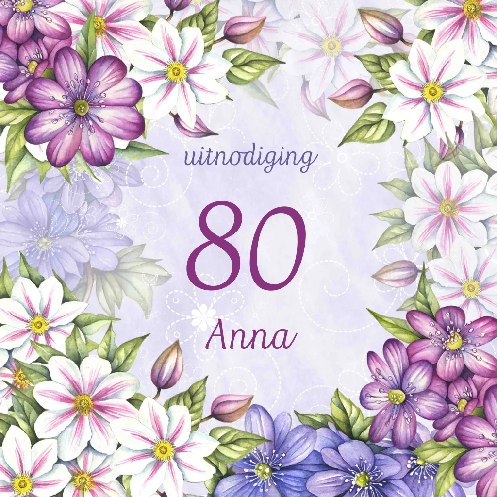 Uitnodiging voor een 80 jaar verjaardagsfeestje met mooie clematisbloemen in paars roze tinten. (4989)