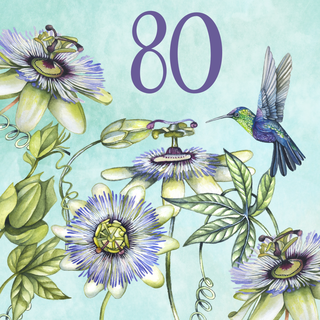 Uitnodiging hummingbird met tropische passiebloemen op lichtblauwe achtergrond in aquarel. Voor een 80e verjaardag. (6474)