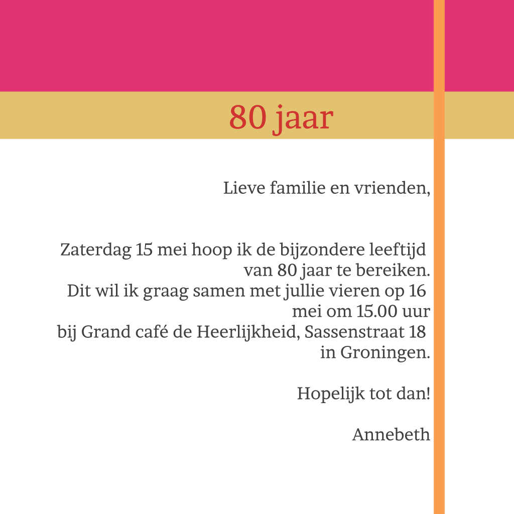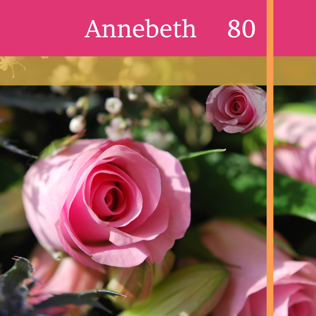 Stijlvolle kaart voor tachtigste verjaardag roze met goudkleurige balk en een roos in het midden. (499)