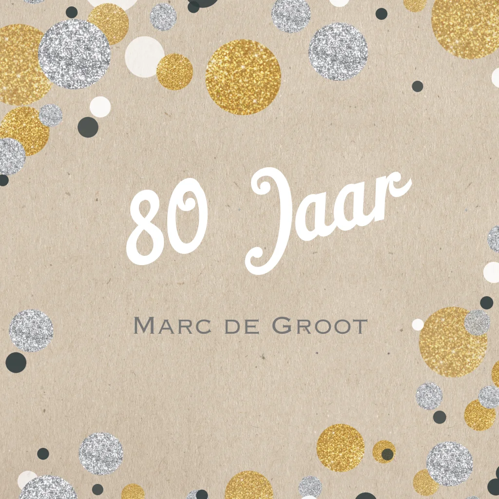 Uitnodiging 80 jaar met confetti in zilver en goudlook en kraft, teksten zijn geheel aanpasbaar. (5297)